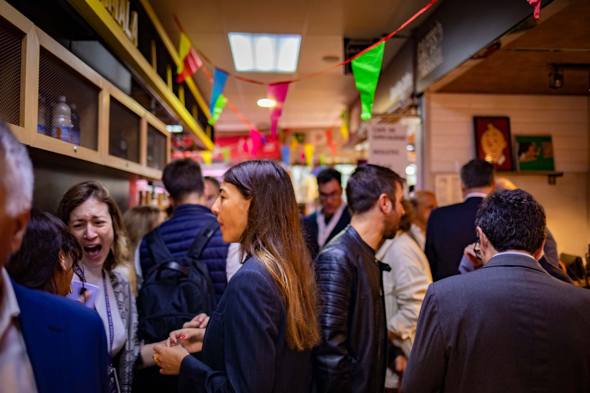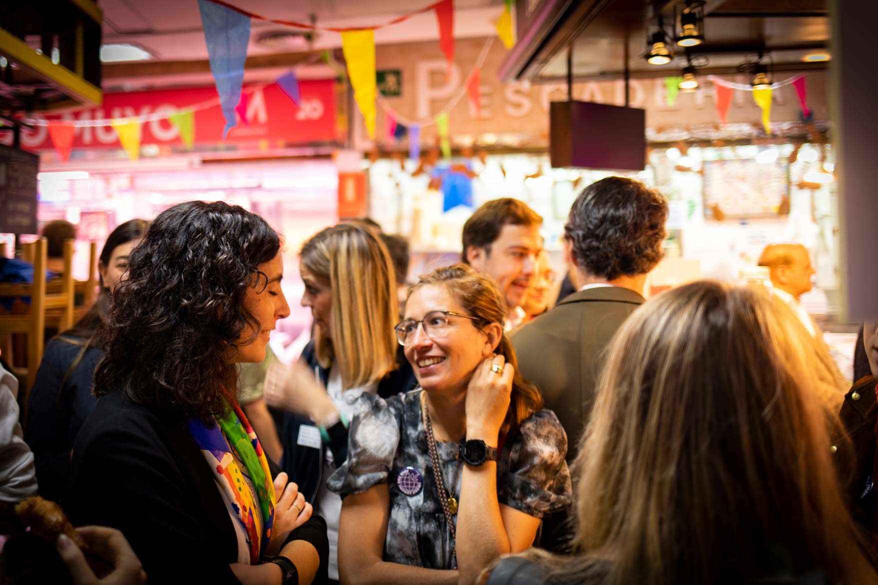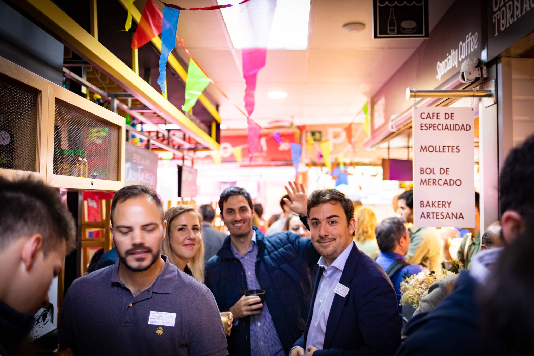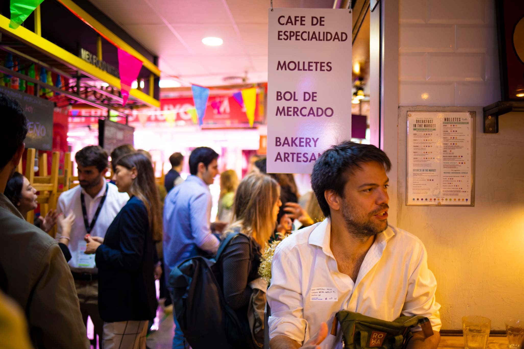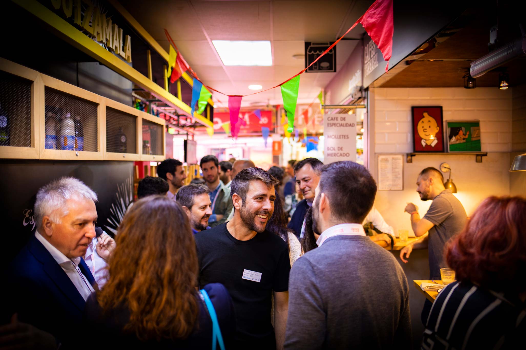 Startups y Fondos de inversión interactuando en el Mercado de Antón Martín durante el MadBlue Impact Morning Mixer.