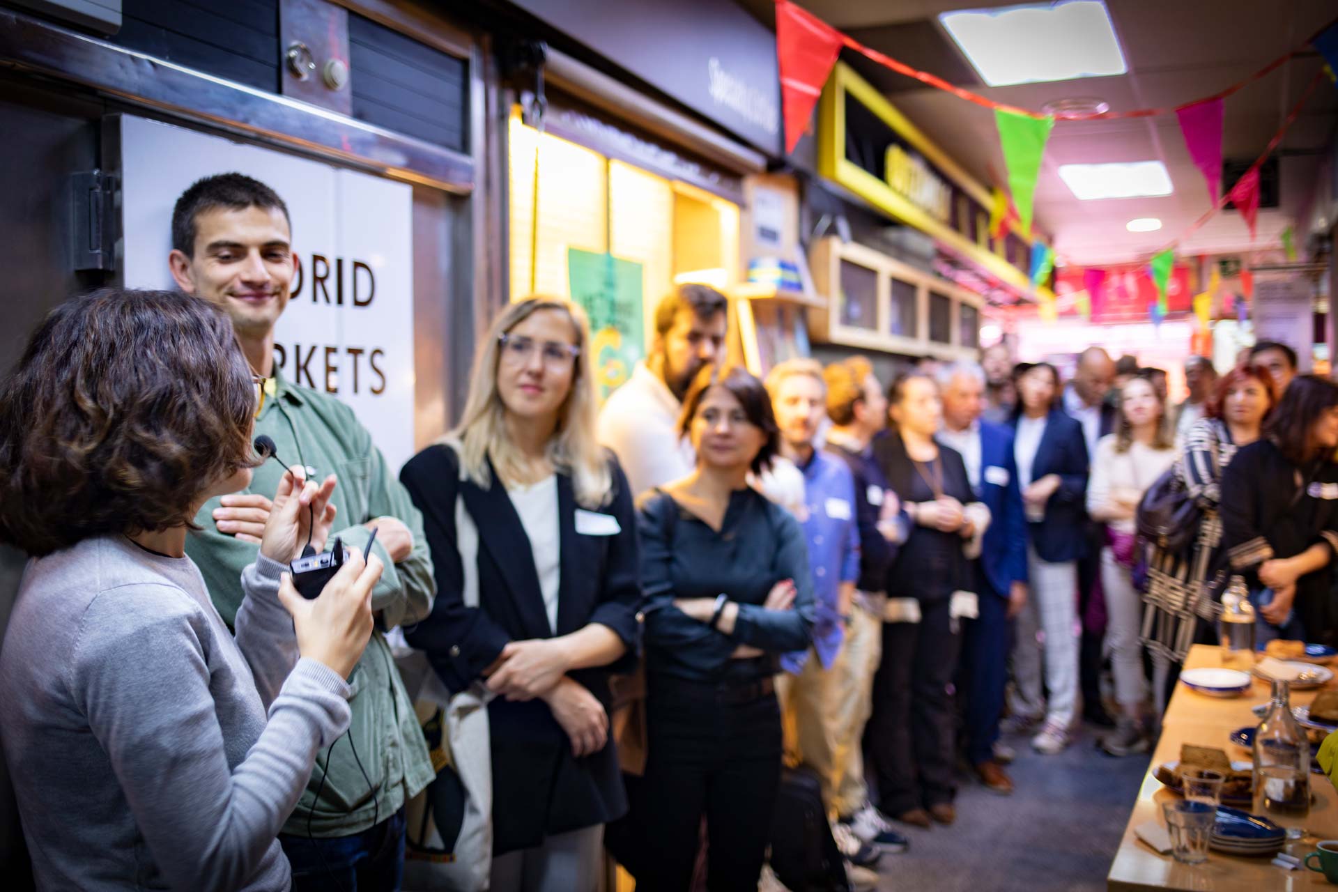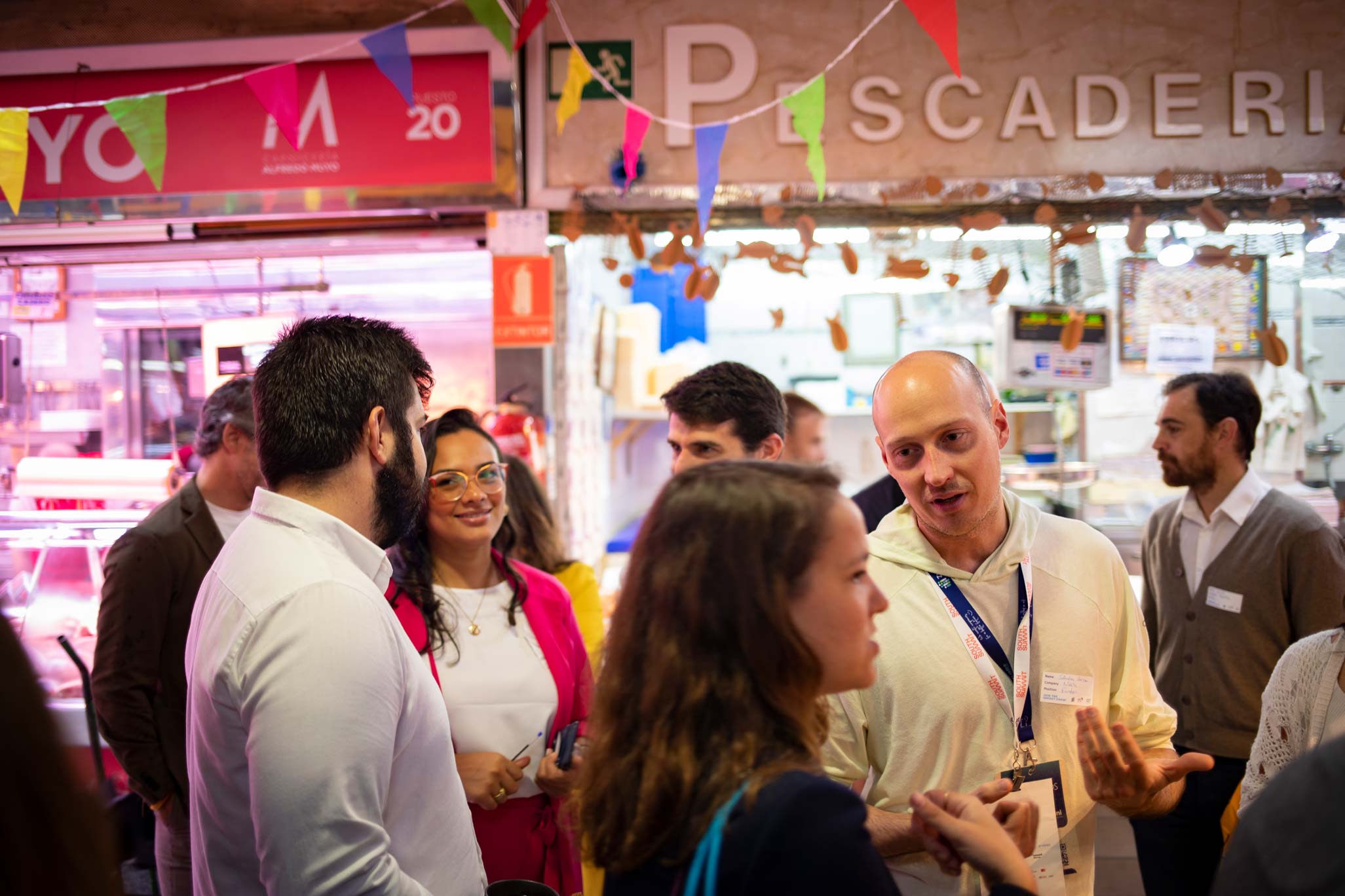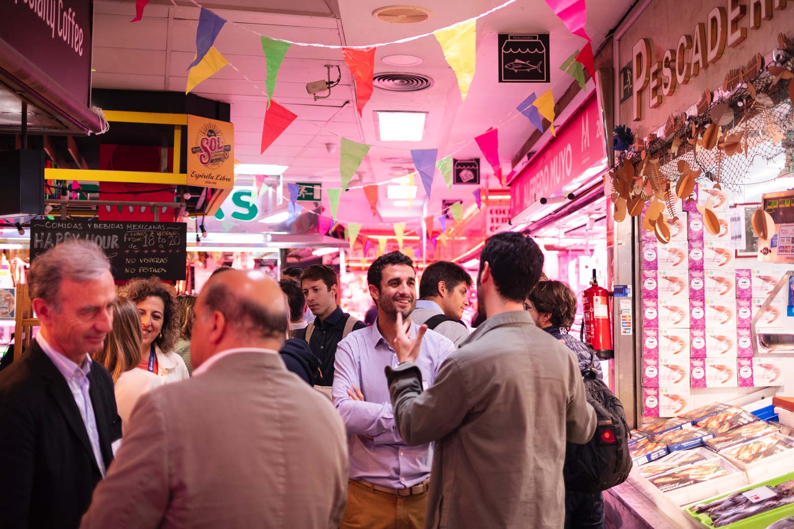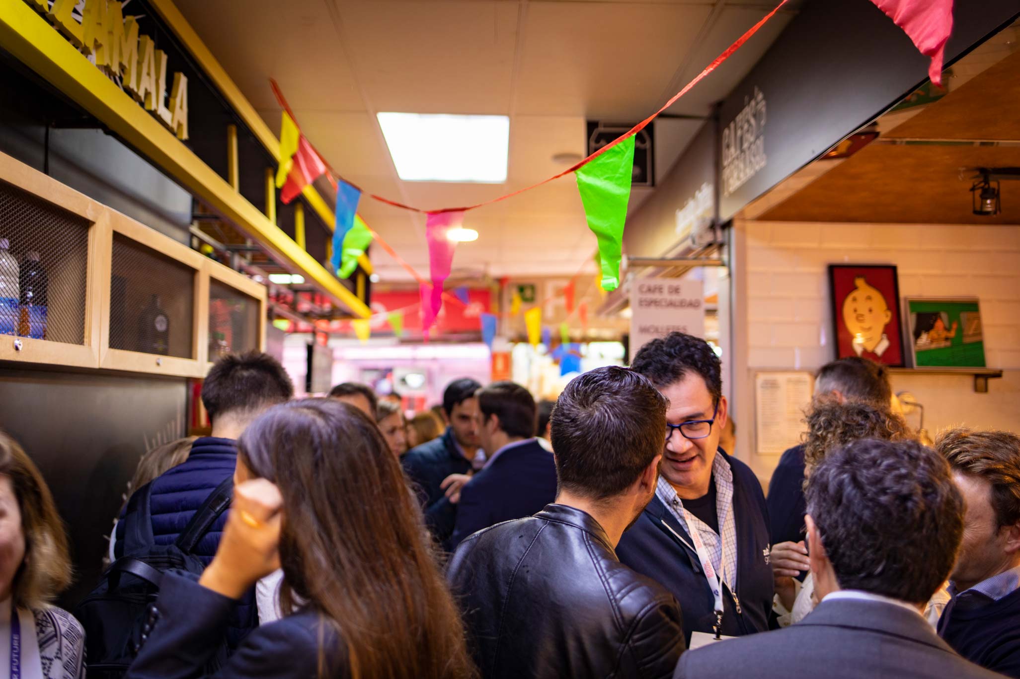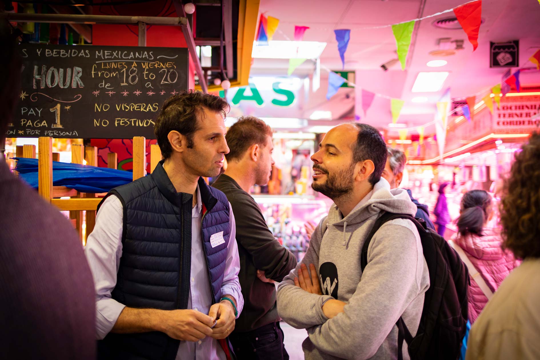 Startups y Fondos de inversión interactuando en el Mercado de Antón Martín durante el MadBlue Impact Morning Mixer.