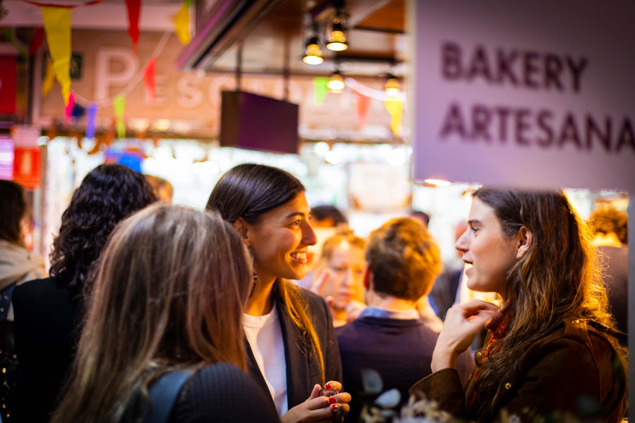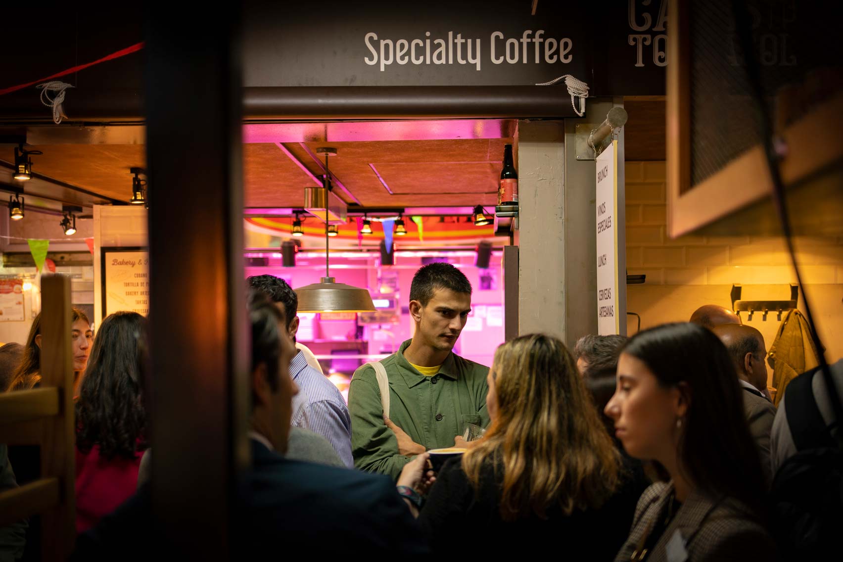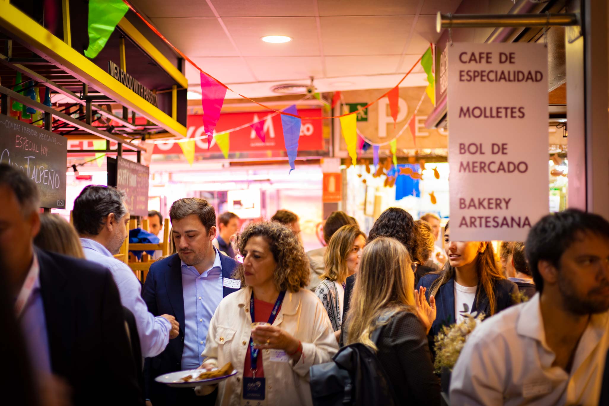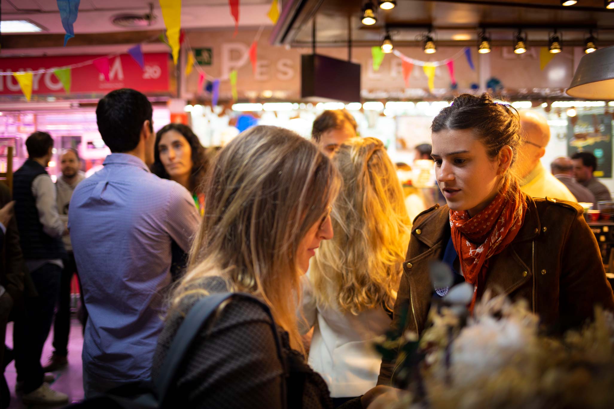 Startups y Fondos de inversión interactuando en el Mercado de Antón Martín durante el MadBlue Impact Morning Mixer.